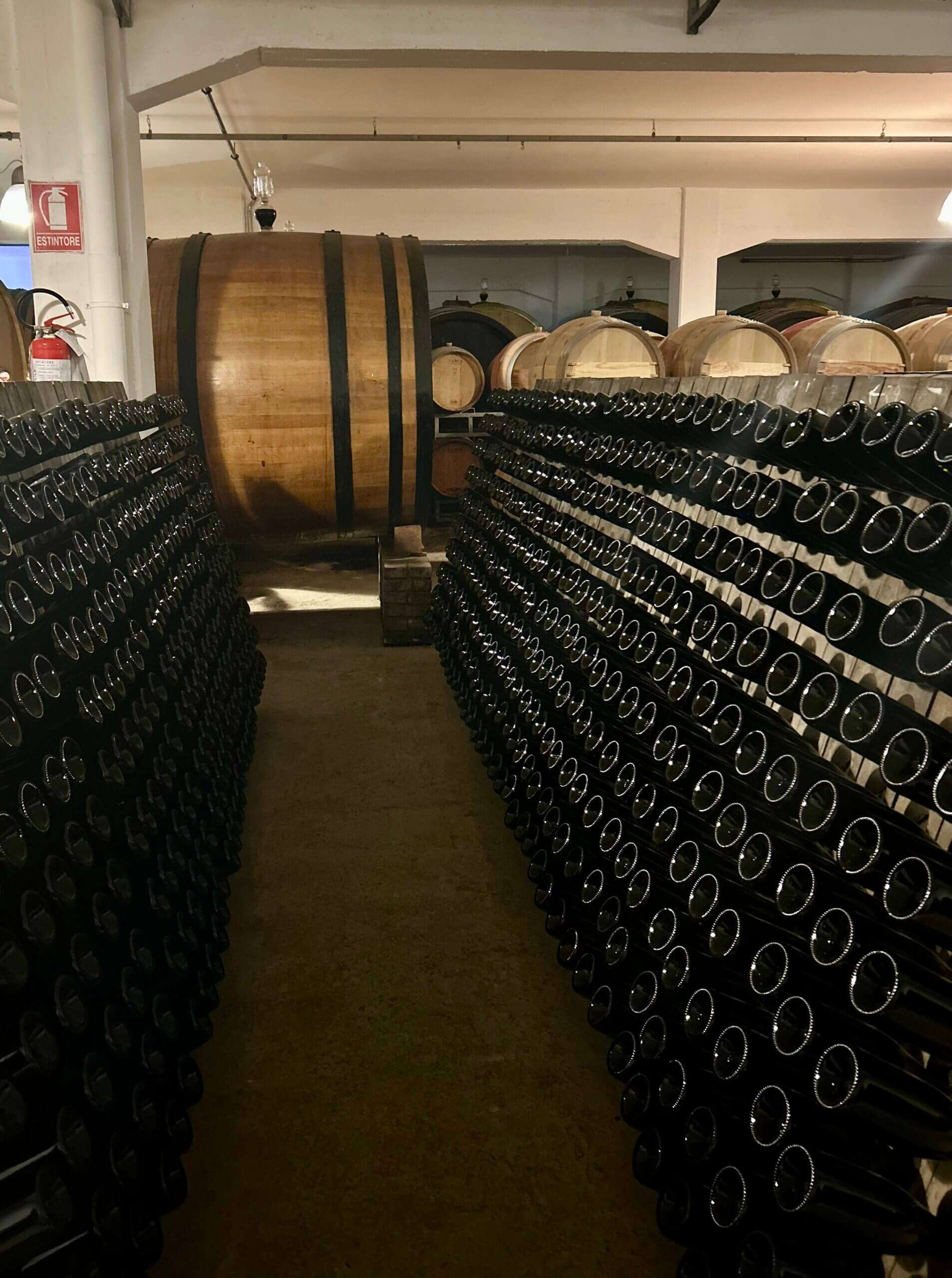 De wijnkelder van Colonnara is indrukwekkend: rijen flessen die langzaam handmatig gedraaid worden, rustend op de lie. Een prachtig ambacht om te zien.